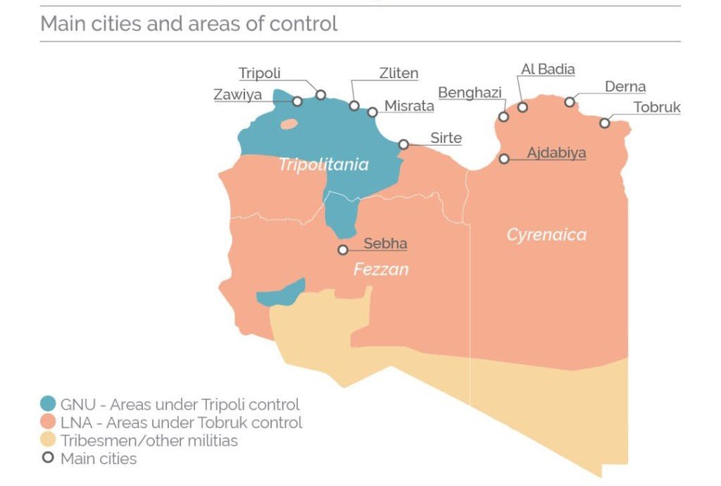 Libya is effectively split into two competing administrative and military poles. In the west, the internationally recognized Government of National Unity (GNU), based in Tripoli, is led by Prime Minister Abdul Hamid Dbeibeh. The GNU’s control relies heavily on an alliance of localized armed groups and militias, including the Deterrence Apparatus for Combating Organized Crime and Terrorism (Rada), the Stability Support Authority (SSA), and the 444 Brigade, which dominate the capital. Externally, the GNU is backed by Qatar and Turkey, the latter utilizing its position in western Libya to pursue its “Blue Homeland” strategy for greater maritime influence in the Mediterranean.